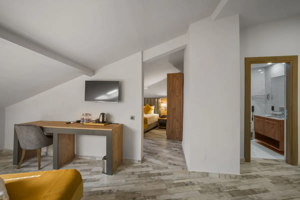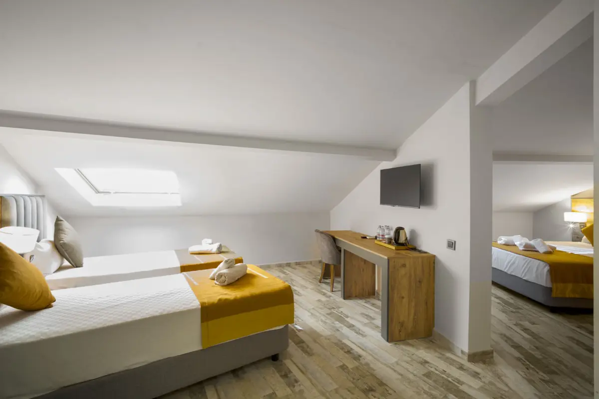 Odamız 4 kişiliktir. Yatak odasında 1 adet çift kişilik yatak, diğer odada iki ayrı yatak mevcuttur. Odada balkon bulunmamaktadır. Oda genişliği 35 m²’dir.