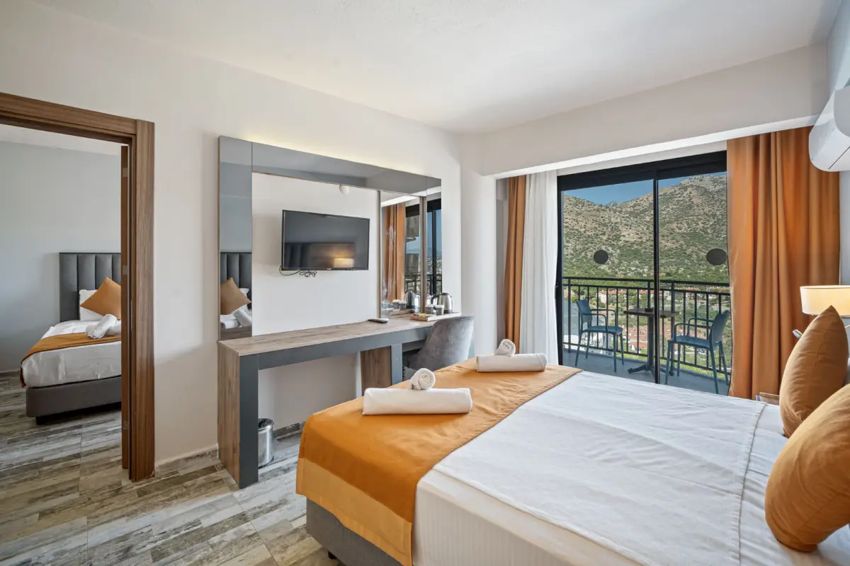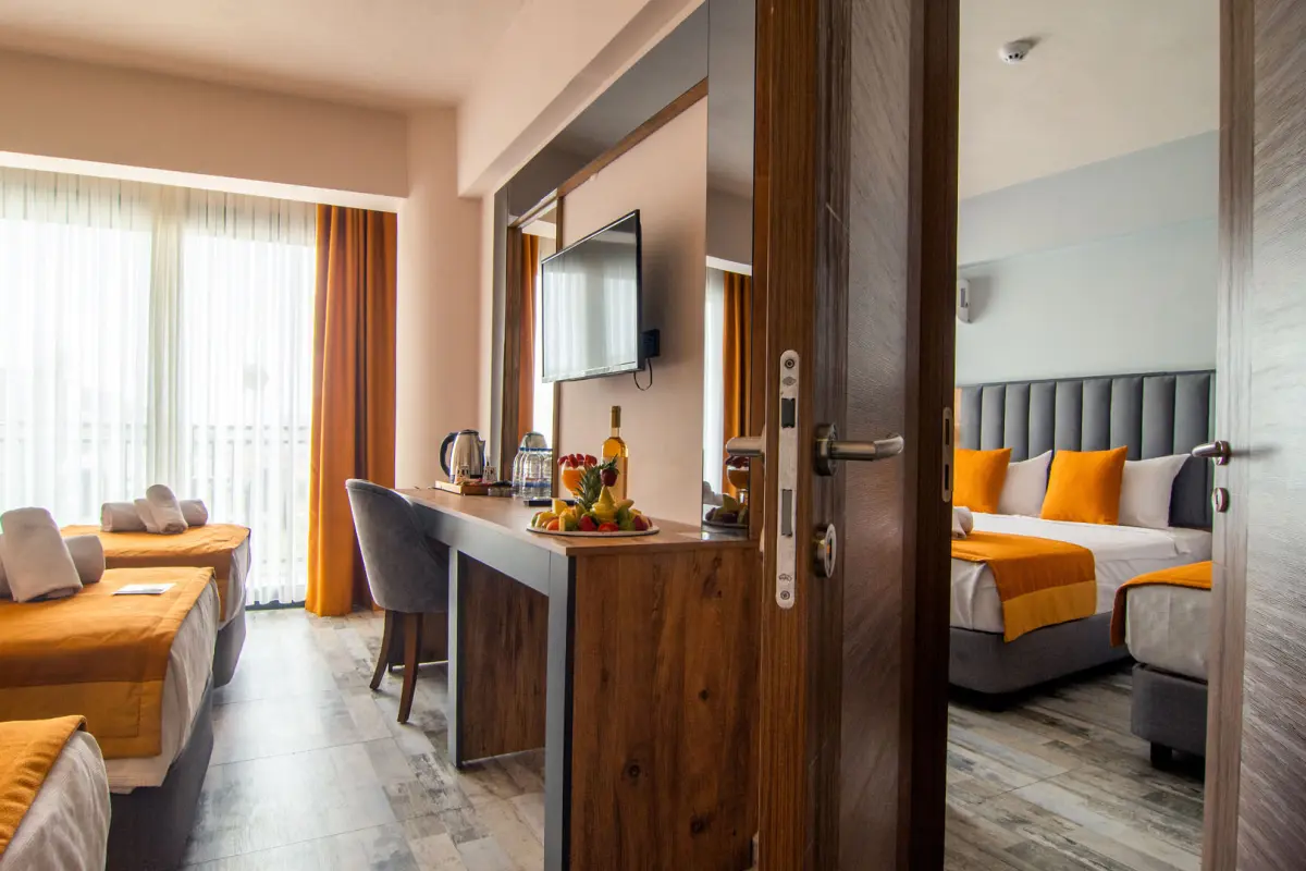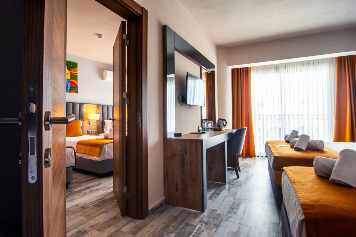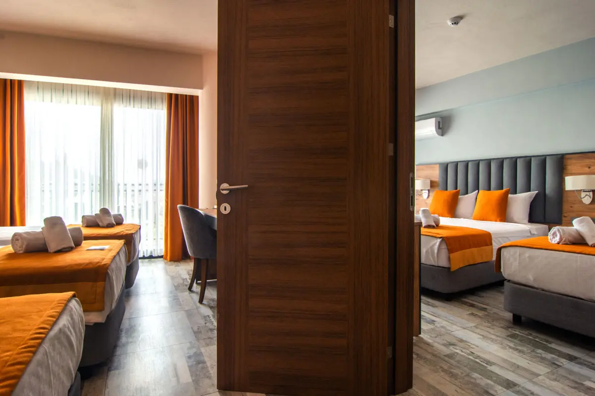 Bir odada çift kişilik yatak veya 1 adet tek kişilik yatak. Diğer odada 3 ayrı tek kişilik yatak